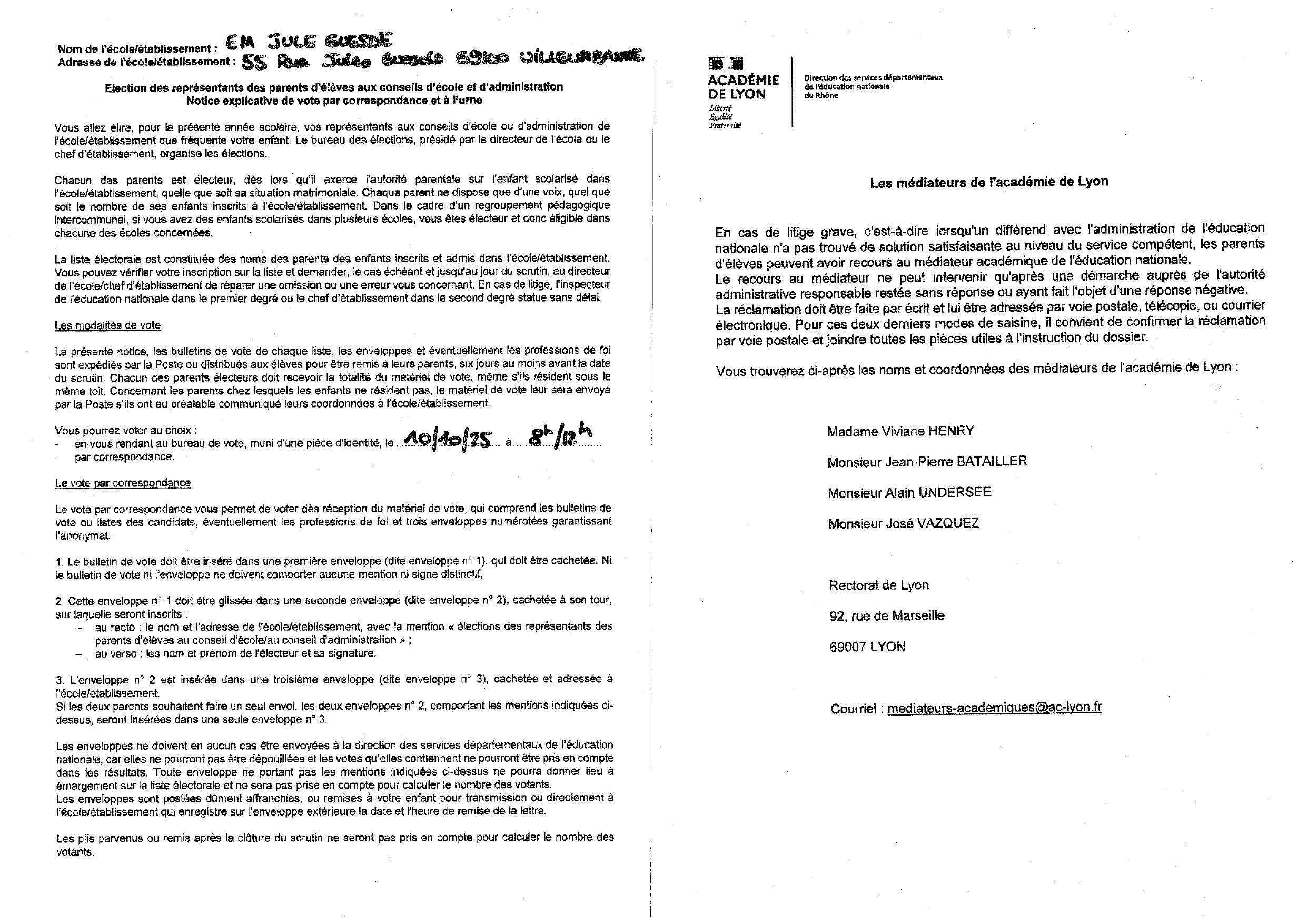 V 03/10 : Le matériel de vote par correspondance est remis aux familles
